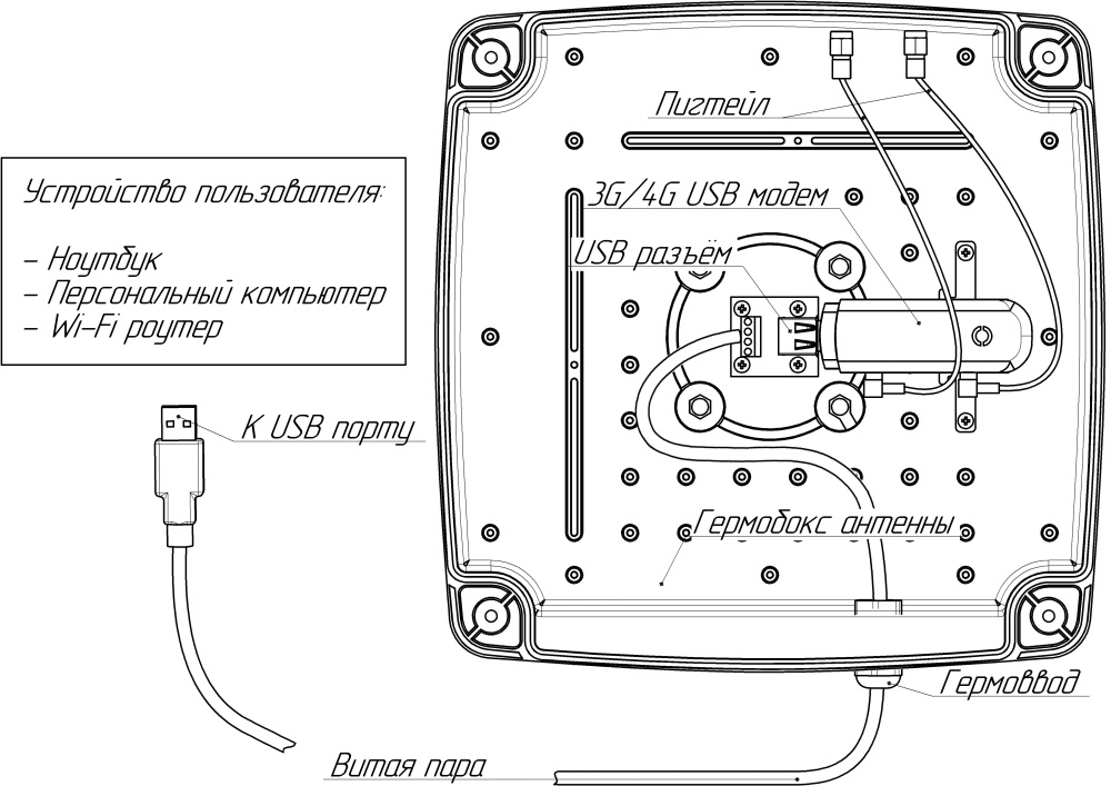 Связь модема с ПК или роутером, расположенными в помещении, осуществляется посредством USB-удлинителя по UTP кабелю "витая пара" (10 метров). Корпус антенны надежно защищает оборудование от погодных условий!