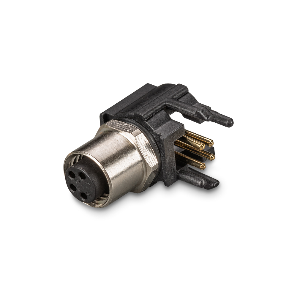 Разъём питания, M8 - типа, розетка(мама), 4 контакта, угловой, под пайку на плату.